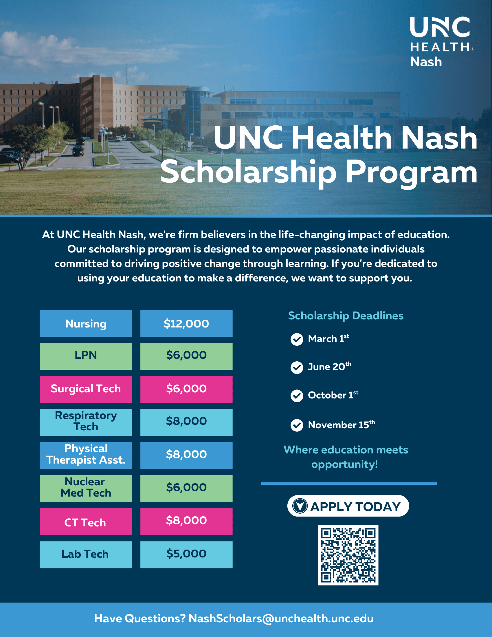 UNC Health Nash is proud to offer scholarships that empower passionate individuals committed to making a difference through healthcare. Our program supports rising Nursing and Allied Health students who are dedicated to using their education to drive positive change in our community. In return for this investment, recipients commit to two years of service at UNC Health Nash after graduation. If you are pursuing a career in Nursing or Allied Health and wish to apply, please review the scholarship guidelines carefully before submitting your application below.